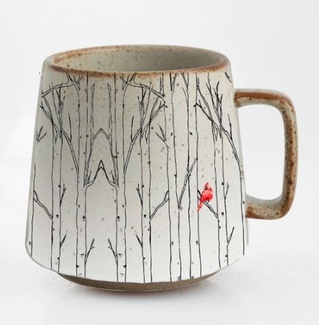 This 12 oz stoneware mug features an originally hand-illustrated snowy woodland scene with slender aspen trees and a vibrant red cardinal perched among the branches. A perfect blend of artistry and function, this mug evokes peaceful winter landscapes while offering everyday practicality. Capacity: Approx. 12 oz dimensions: approx. 3 inch diameter (without handle) x 3.5 inch height. Materials, durable ceramic Care: Microwave and dishwasher safe