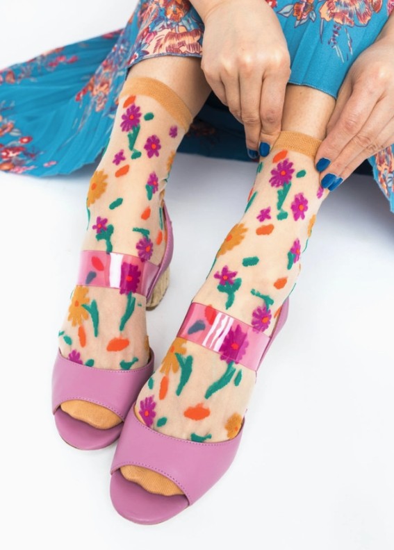 Feel like Spring all year round in vibrant florals paired with a bold heel and delicate sheer body. This sheer floral sock is designed to be worn with your seasonal transition shoes, such as a heeled mule or closed toe sandal.