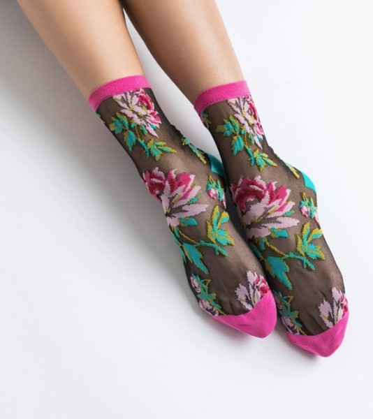 Transition seamlessly from Winter to Spring with romantic pink roses set against black sheer fabric for a charming English garden vibe. The contrasting turquoise heel and leaves add an unexpected pop of color to this black floral sock.