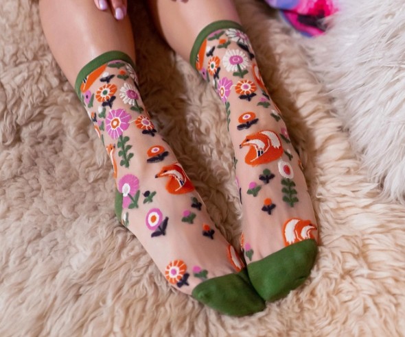 Our Feeling Foxy Sheer Sock features geometric style foxes interspersed with graphic florals for a Scandinavian chic look. A gradual progression in print density from the feet to ankle gives this sock a modern vibe, perfect for pairing with strappy sandals and chunky clogs. Finished with an olive green heel, toe and cuff, these fox print socks are sure to become your next Fall staple.