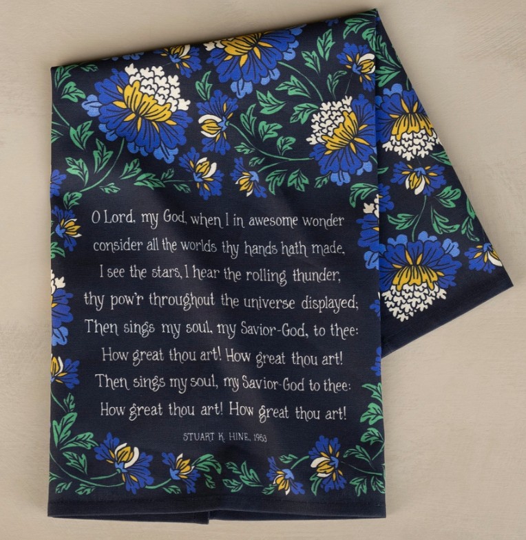 Brighten your home with color and song. The How Great Thou Art hymn tea towel is printed in full color and features lyrics from the hymn. Made of 100% cotton, these flour sack tea towels easily and cost-effectively replace disposable paper towels with high absorbency and durability. Or use as curtains or a wall display. Generously sized, lint free, and made to last a lifetime. Perfect for gift giving. Illustrated by Kate Whitley.