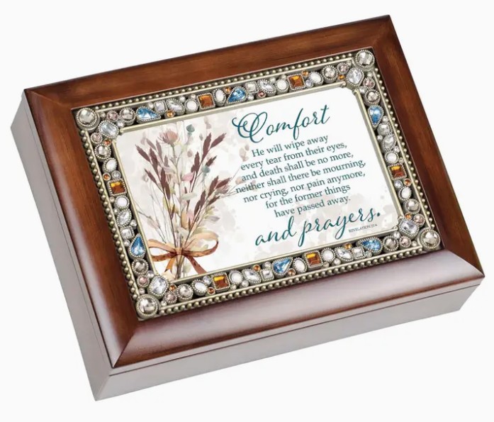 This Musical Keepsake Box Is Set With Sparkling Gem-Like Stones In A Dainty Antiqued-Gold Beaded Trim. Edges Of Lid/Sides Of Box Have A Deep Espresso Finish W/Soft Amber Tone Highlights Showing A Distressed Woodgrain Pattern. The Hinged Lid Is Also A Photo Frame; It Comes With An Art Print. Print Can Be Changed Out For A 6X4 Photo. Inside Box Is A Small Compartment With Clear Glass Top That Shows The High Quality Sankyo Musical Movement. When Key Is Wound, Music Will Play When Lid Is Open And Stop When Closed. Plays: How Great Thou Art. Storage Compartment Has A Luxurious Black Velvety Lining. Decorative Legs On Bottom Padded To Protect Furniture. Box Made Of A Super-Sturdy Polymer-Resists Cracking/Chipping.