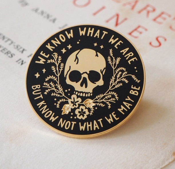 Part of our Shakespeare’s Heroines collection, this black and gold enamel pin features an intricate skull design and bears the Ophelia quote: “…we know what we ar...