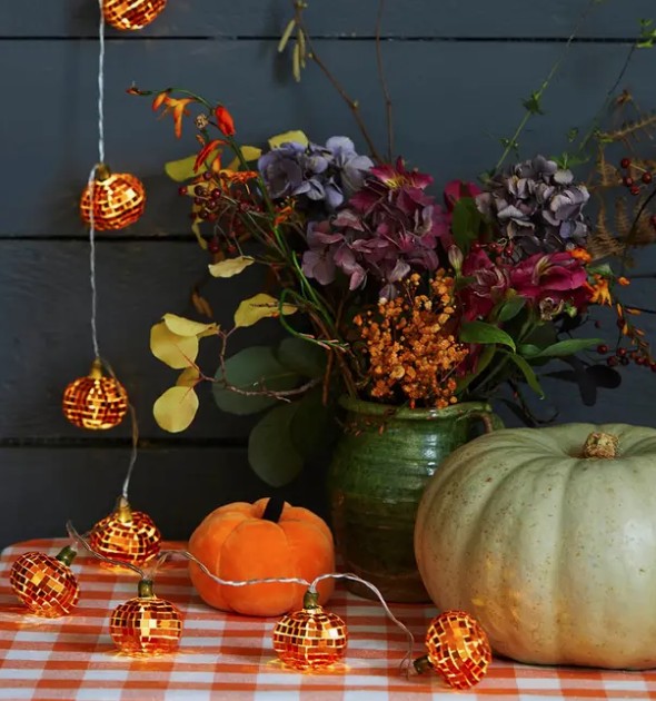 Add sparkle to fall d?cor with these Autumn Hues Pumpkin Disco String Lights. Featuring 10 LED mini mirror ball pumpkins in warm, seasonal tones, they?re battery-operated for easy ...