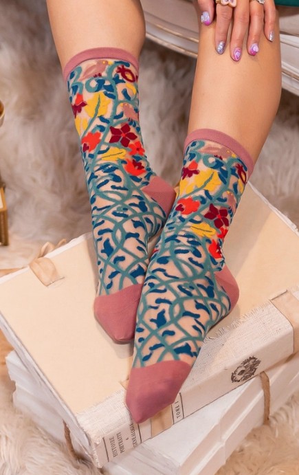 Vintage tapestry vines form into Fall florals, vibrant buds, and whimsical birds on this earthy sheer sock. The duo print design allows you to change up your look and pair with everything from chunky clogs to ankle boots. A bohemian color palette gives this tapestry print sock a free-spirited vibe.