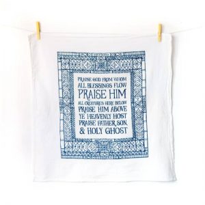 The doxology with geometric border design printed in peacock blue on a 100% cotton tea towel. Comes folded with a belly band for gift giving. This tea towel looks lovely when folded to display on your sink or oven. 100% cotton, machine washable.