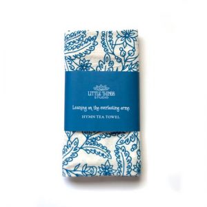 Leaning on the everlasting arms with floral design printed in ocean blue (new color!) on a 100% cotton tea towel. Comes folded with a belly band for gift giving. This tea towel looks lovely when folded to display on your sink. 100% cotton, machine washable.