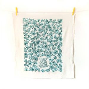 This is my father?s world with floral design printed in emerald on a 100% cotton tea towel. Comes folded with a belly band for gift giving. This tea towel looks lovely when folded to display on your sink or oven. 100% cotton, machine washable.